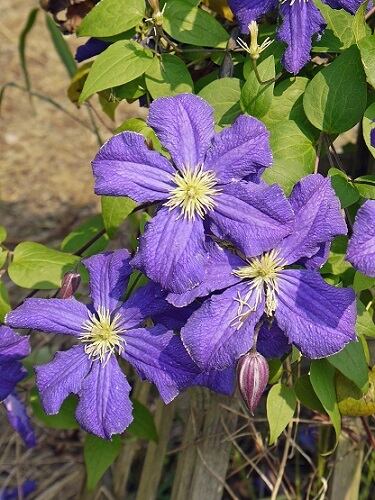 花形、花色ともに「ジャックマニー」に似る、青紫色の美しい4弁の星咲き。花弁はややカールし、反り返る。花つきよく、強健で育てやすい。鉢植え、庭植え向き。バラとの組み合わせにも向く。四季咲き性。